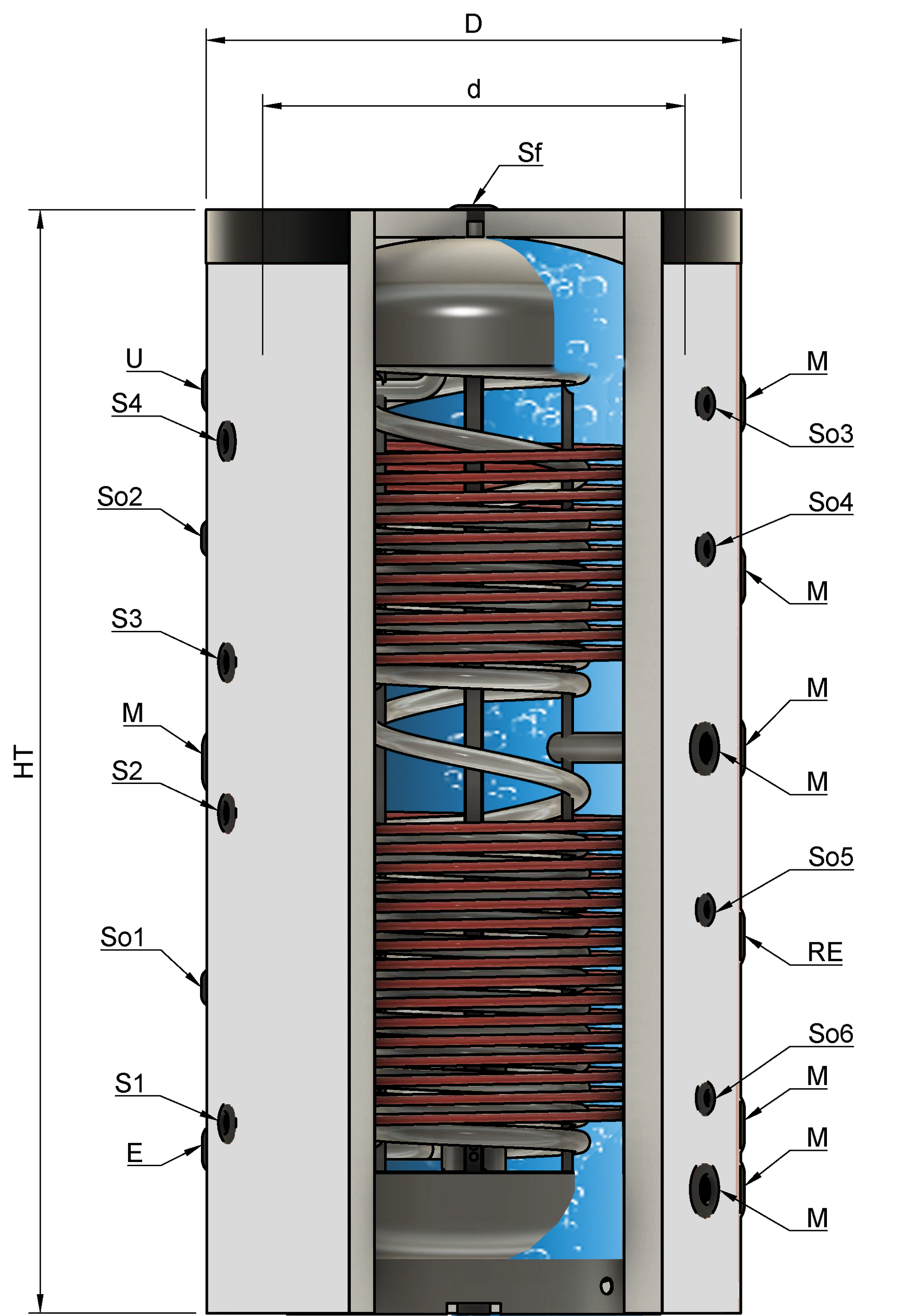 Art. VRD serbatoio volano per impianti di riscaldamento con doppio serpentino fisso + scambiatore sanitario.