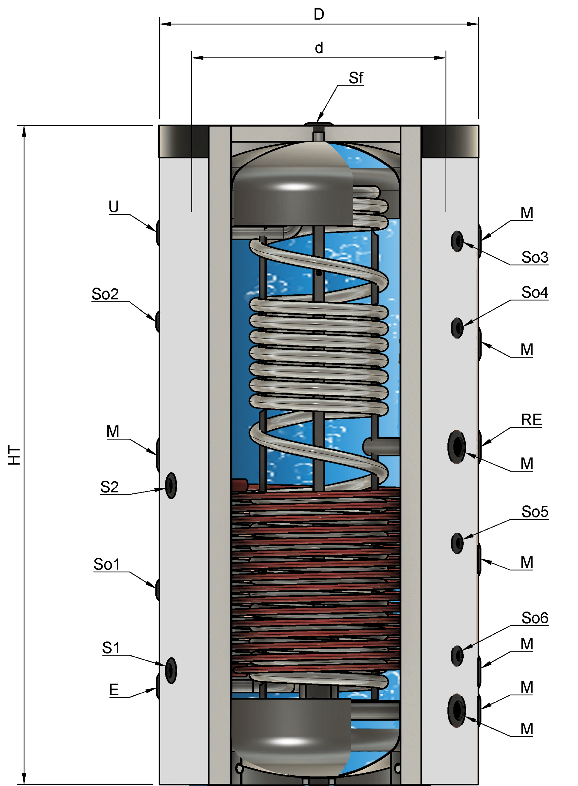 Art. VRU serbatoio volano per impianti di riscaldamento con singolo serpentino fisso inferiore + scambiatore sanitario.