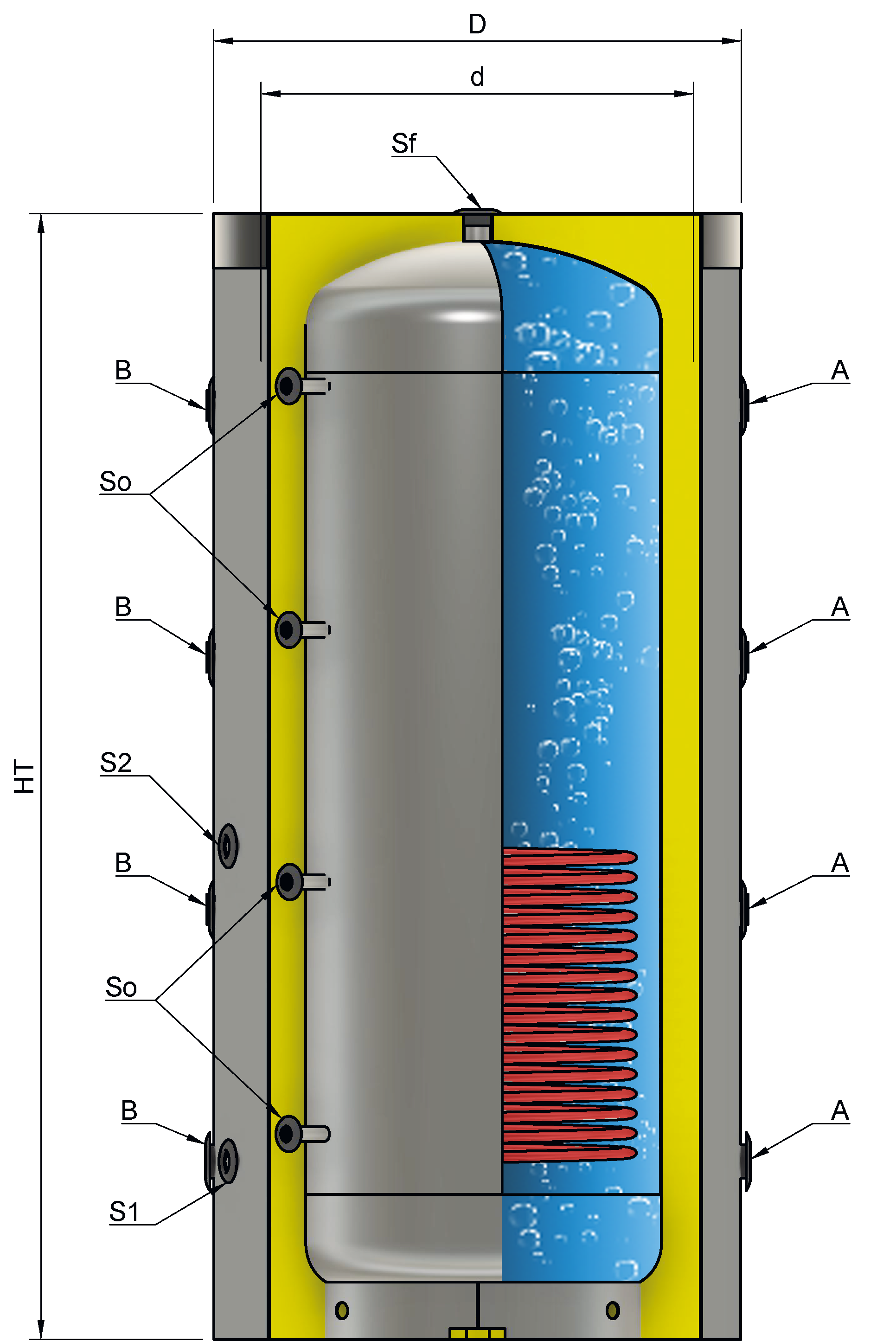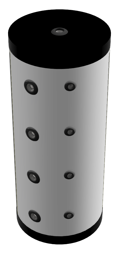 IMPIEGHI: Volano termico “PUFFER” per impianti di riscaldamento con scambiatori all’interno del volano (a seconda delle versioni).