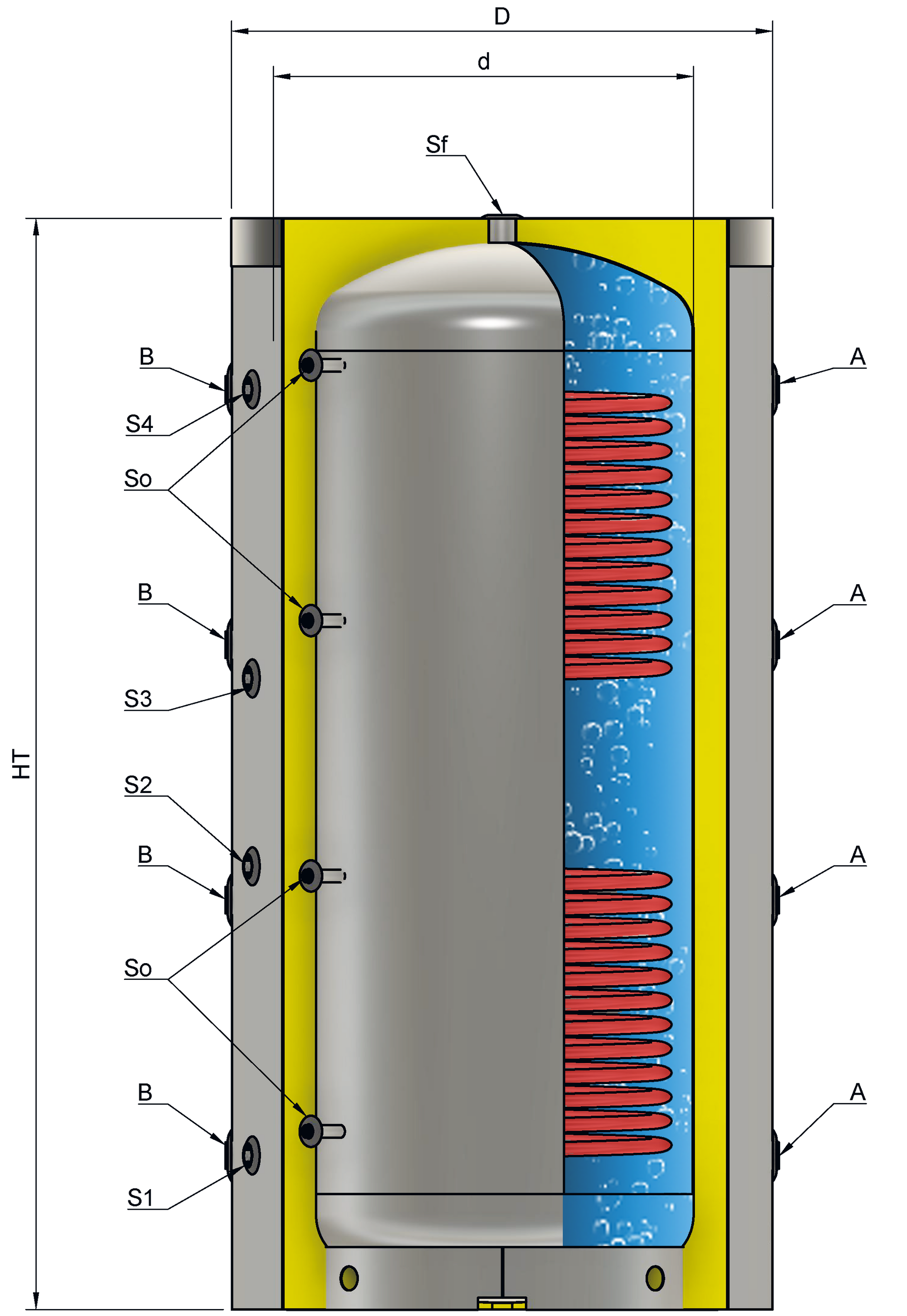 IMPIEGHI: Volano termico “PUFFER” per impianti di riscaldamento con scambiatori all’interno del volano (a seconda delle versioni).